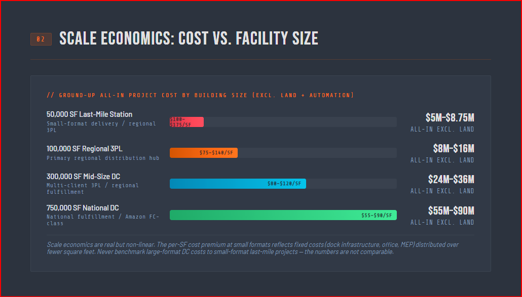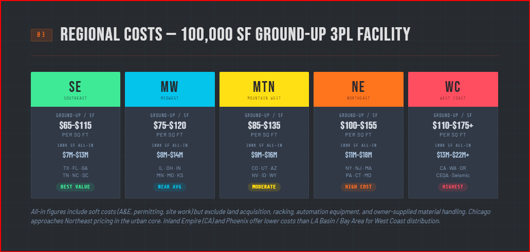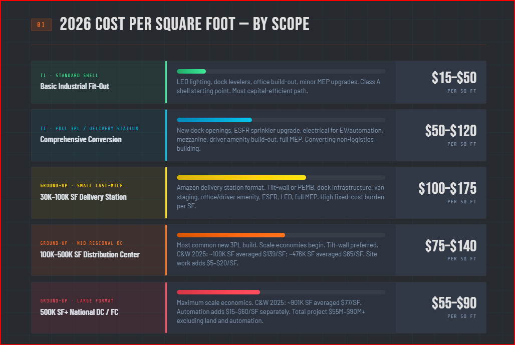 A typical ground-up 100,000-square-foot 3PL facility in a Southeast or Texas market runs $7 million to $13 million all-in, excluding land. A 50,000-square-foot last-mile delivery station in the same markets runs $5 million to $8.5 million all-in, excluding land. Maxx Builders' 2025-2026 Texas industrial cost analysis confirms ground-up warehouse costs in Texas ranging from $130 to $220 per square foot for standard facilities, with smaller buildings carrying higher per-square-foot costs due to fixed-cost distribution.
