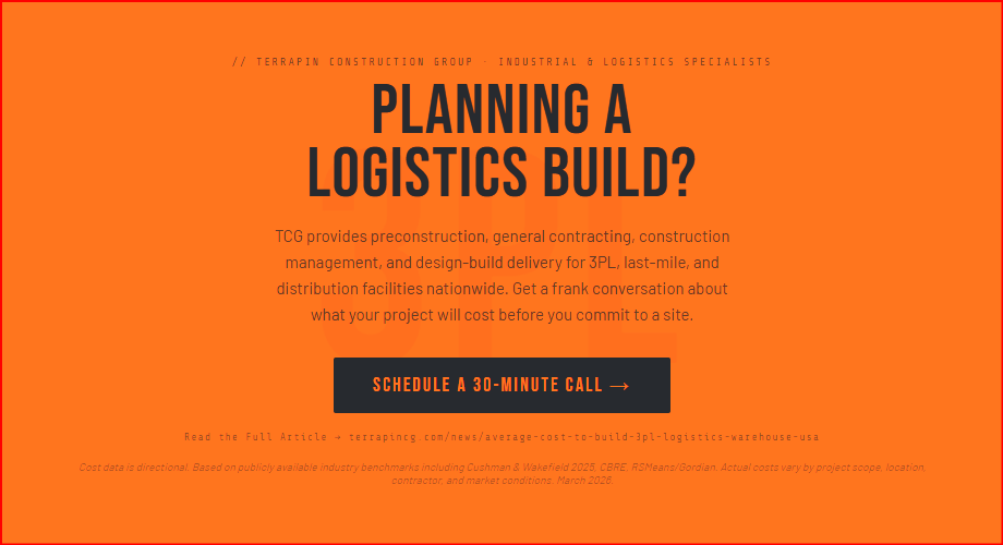 For commercial real estate developers, logistics operators, and investors planning new facilities, the cost question is often the first and most urgent one. But "logistics facility" covers an enormous range of building types, operational configurations, and infrastructure requirements. A 1-million-square-foot fulfillment center for a national operator and a 40,000-square-foot last-mile delivery station for a regional carrier are both "warehouse builds" — and they have almost nothing in common from a construction cost standpoint. This article breaks down what 3PL and logistics facility construction actually costs in 2026, by facility type, delivery method, and U.S. region. At Terrapin Construction Group, we build commercial and industrial projects across all 50 states. The cost data here draws on our own project experience combined with current benchmarks from RSMeans/Gordian, Cushman & Wakefield's 2025 Industrial Construction Cost Guide, CBRE's Warehouse and Distribution Construction Cost Trends Report, and active industrial construction markets nationwide.