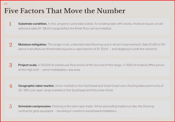 Substrate condition is the most common source of flooring cost surprises. A new concrete slab poured to proper specifications — flat, level, cured, and free of moisture issues — is the ideal substrate for any flooring system. An existing slab with cracks, unevenness, moisture vapor transmission above manufacturer thresholds, adhesive residue from previous flooring, or structural deficiencies requires preparation work that adds $1 to $8 per square foot before the finish floor can be installed. Moisture mitigation alone — applying a moisture vapor barrier to a slab that exceeds acceptable MVER or relative humidity limits — runs $1 to $3 per square foot and is the single most frequently underestimated flooring cost in tenant improvement projects.