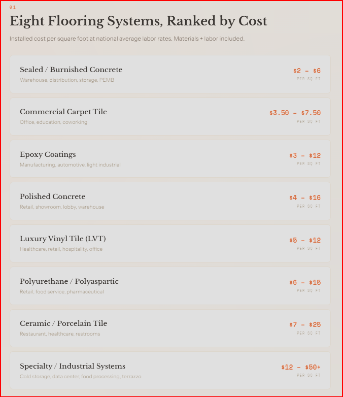 The Eight Major Commercial Flooring Systems and What They Cost in 2026
