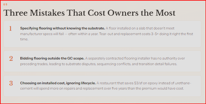 The first is specifying flooring without understanding the substrate. An architect or designer who selects a flooring material without knowing the concrete slab's moisture vapor emission rate, flatness tolerance, and curing schedule is setting up a failure. Flooring manufacturers' warranties require specific substrate conditions, and a floor installed on a slab that doesn't meet those conditions will fail — often within the first year. The cost to tear out and replace a failed floor is 3 to 5 times the cost of doing it right the first time. TCG's preconstruction process includes slab specification review as part of the flooring scope to prevent this.