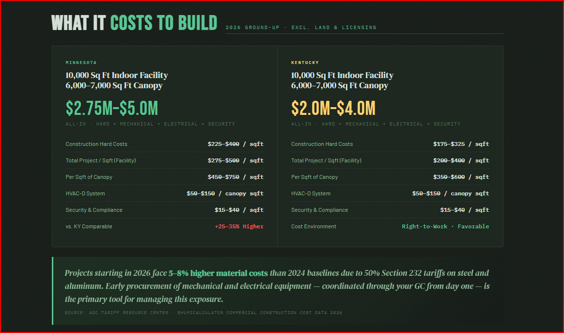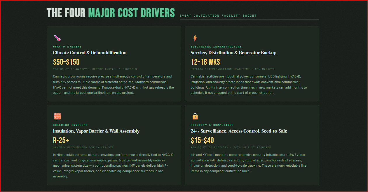 The building envelope comes next. A cannabis cultivation facility requires a high-performance shell — high R-value walls, positive and negative pressure control, hermetic sealing between grow rooms, washable surfaces, and odor containment. In Minnesota specifically, industry data pegs indoor cultivation facility construction at $300 to $450 per square foot — reflecting the additional envelope performance demands of a cold-climate build. In Kentucky and other South-Central markets, construction costs are more favorable, running 10–20% below that range due to competitive labor markets and lower material costs.