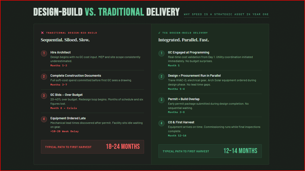 The traditional construction delivery sequence — hire an architect, complete design, go to bid, select a GC, break ground — is poorly matched to the business realities of an emerging cannabis market. In a market where the first 12 months of operation at premium wholesale prices can determine whether a facility is profitable over its entire license term, every month of schedule delay is a direct revenue impact. Operators who enter the traditional sequence often spend four to eight months getting through design and permitting before a shovel hits the ground. Then they get a GC bid that comes back over budget and spend another two months in value engineering and redesign.