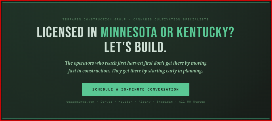 If you're a licensed or pre-approved cultivator in Minnesota, Kentucky, or any other emerging market and want a frank, no-cost conversation about what your facility will cost and how fast we can get it built, schedule a 30-minute call with our team.
