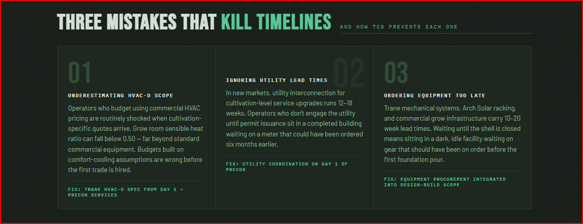 The design-build delivery model TCG uses eliminates this sequence entirely. We engage with the operator at the concept stage — before design documents exist — and bring our preconstruction team into the process alongside the design team from day one. Every design decision is evaluated in real time against current market construction costs. Systems are specified with procurement lead times in mind, so long-lead HVAC equipment, electrical gear, and specialty cultivation systems are on order before construction begins rather than after. The result is a compressed timeline that gets operators into production months earlier than the conventional sequence — and a budget that reflects market reality rather than optimistic architectural estimates.