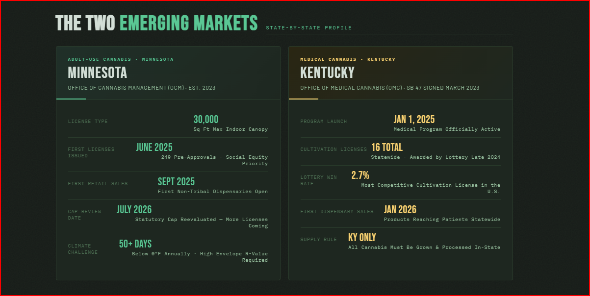 The map of legal cannabis in the United States keeps redrawing itself. While established markets in Colorado, California, and Illinois have matured into competitive, price-compressed environments, a wave of newer state programs is creating a fundamentally different opportunity: markets where supply is critically short, wholesale prices are high, and the cultivators who build first win disproportionately. Minnesota and Kentucky are two of the most compelling examples right now. Both programs launched or significantly accelerated in 2025. Both have acute supply gaps. And both are markets where the construction clock is the competitive advantage — because operators who can get their facilities built, licensed, and producing in the next 12 to 18 months stand to capture premium wholesale pricing that won't last once supply catches up.