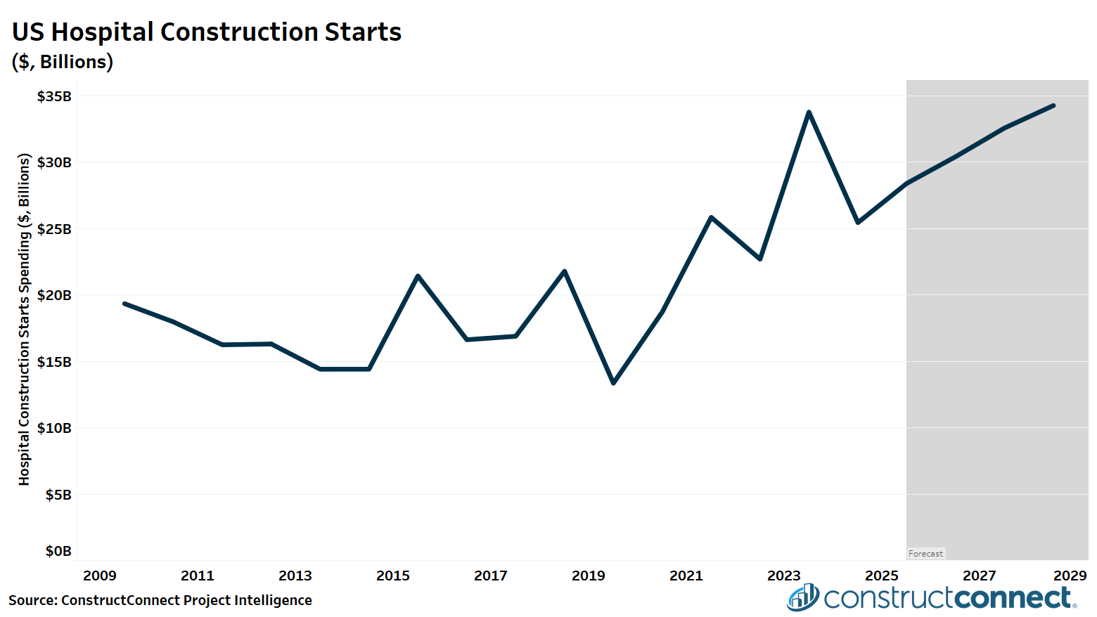 Hospital construction in the United States is in the middle of one of its most significant growth cycles in recent memory. After a sharp contraction during the pandemic years — when spending on hospital starts fell to just $13.4 billion in 2020 — the market has rebounded with extraordinary force. According to ConstructConnect project intelligence data, hospital construction starts reached $33.8 billion in 2024, and forecasts project that figure to surpass $34.3 billion by 2029.