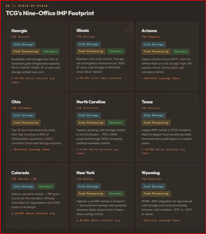This article covers the IMP supply-and-install landscape across the nine states where TCG operates offices — Georgia, Illinois, Arizona, Ohio, North Carolina, Texas, Colorado, New York, and Wyoming — with a focus on the three project verticals driving the greatest IMP demand in 2026: cold storage, food processing, and cannabis cultivation. For each state, we cover the market demand drivers, the construction cost environment, the IMP specification considerations specific to the regional climate and regulatory landscape, and how TCG's local office presence translates into better pricing, faster mobilization, and tighter project execution.