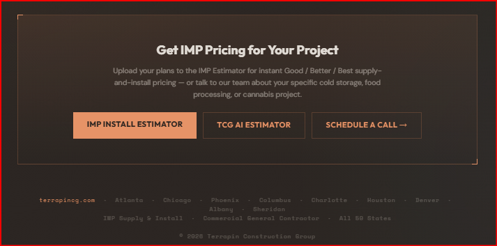 Whether you're building a cold storage facility in Georgia, a food processing plant in Ohio, or a cannabis cultivation operation in Colorado, TCG's IMP Install Estimator provides preliminary supply-and-install pricing for your specific project. Upload your plans and get an instant Good / Better / Best estimate backed by over one million square feet of direct IMP installation experience.