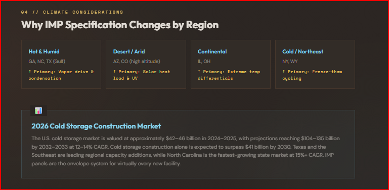 Metl-Span and CENTRIA panels with high-SRI (solar reflectance index) exterior facings are commonly specified for Arizona cold storage projects to reduce the thermal load on the envelope and minimize the cooling energy required to maintain target temperatures. The arid climate does simplify one aspect of IMP installation — humidity-driven vapor migration is less aggressive than in the Southeast — but the extreme heat creates its own challenges for installation scheduling, sealant curing, and worker productivity.