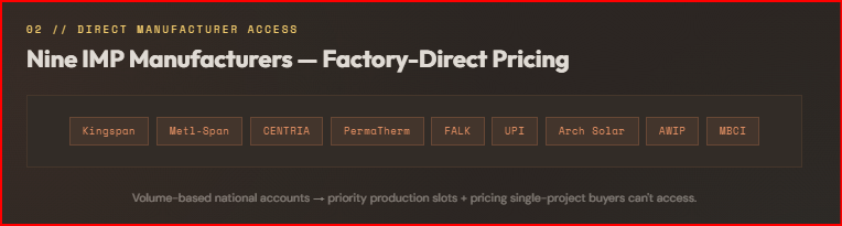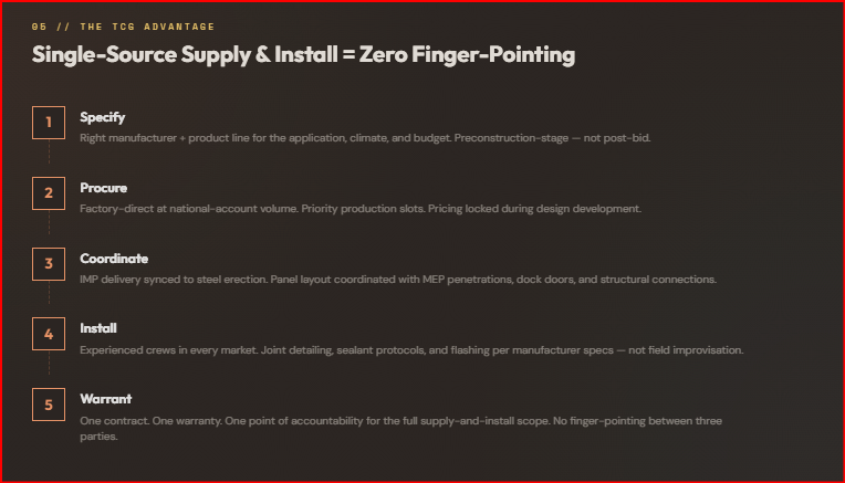 TCG's model eliminates that fragmentation. As detailed in our complete IMP installation guide, we control the full chain from specification through procurement through installation through commissioning. We select the right manufacturer and product line for the application. We procure at volume pricing through our direct manufacturer relationships. We install with crews that have demonstrated proficiency with the specific panel system and joint configuration required by the project. And we warrant the installed system as a single scope of work — not as a collection of disconnected material and labor contracts.
