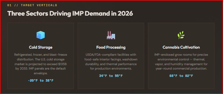 Insulated metal panels are the single most important building envelope specification on any temperature-controlled commercial project. Whether the application is a 200,000-square-foot cold storage distribution center operating at -20°F, a USDA-inspected food processing facility maintaining strict hygiene and thermal performance standards, or a cannabis cultivation facility requiring precise environmental control for year-round production, IMP panels are the system that makes the building work. The panel selection, procurement, and installation quality determine whether the envelope performs for decades or fails within years — and the cost difference between getting it right and getting it wrong is measured in hundreds of thousands of dollars.