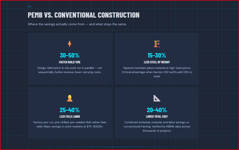 Schedule compression is the largest single source of financial advantage. Because PEMB components are designed and fabricated concurrently with foundation work — rather than sequentially, as in conventional steel or tilt-up concrete construction — total project timelines are 30–50% shorter, according to the MBMA. Faster occupancy means earlier revenue generation for commercial operators and lower carrying costs on construction financing for developers. On a $2 million project with a 7% construction loan, compressing the schedule by three months saves approximately $35,000 in interest alone — before accounting for earlier revenue.