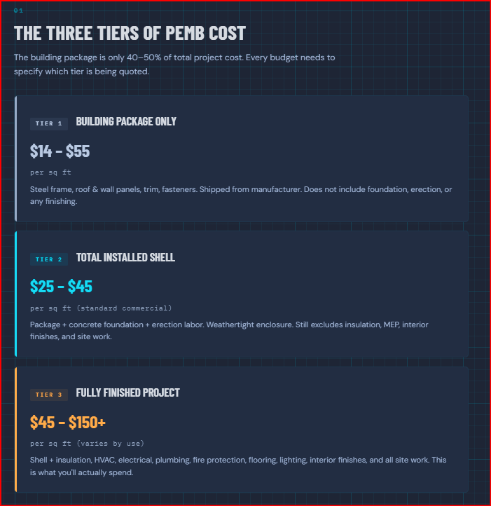 The single most important thing to understand about PEMB pricing is that the building package — the steel frame, roof panels, wall panels, trim, and fasteners that ship from the manufacturer — typically represents only 40 to 50% of the total project cost. Foundation, erection labor, insulation, doors and windows, interior finishes, MEP systems, and site work are all additional. When a manufacturer quotes $14 to $22 per square foot for a building package, they are quoting a fraction of the actual construction cost. Comparing that number to a fully installed conventional building quote is a false comparison that has led more owners into budget trouble than any other single misunderstanding in the PEMB space.
