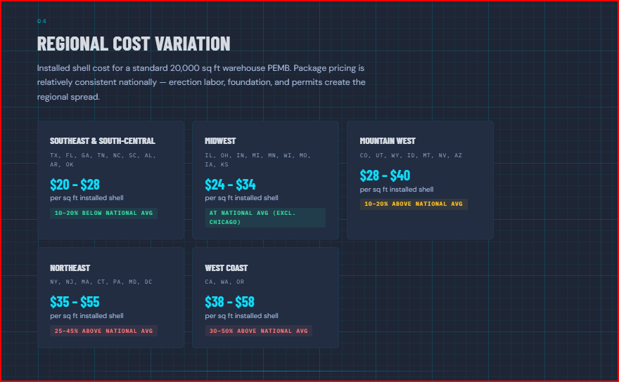 Like all commercial construction, PEMB costs vary significantly by geography. The building package price from the manufacturer is relatively consistent nationally (adjusted for shipping distance from the fabrication plant), but erection labor, foundation costs, permit fees, and local code requirements create meaningful regional cost differences in the total installed project.