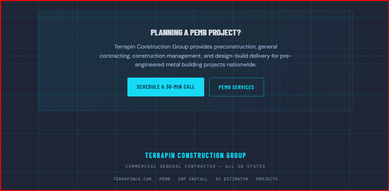 Planning a pre-engineered metal building project? Terrapin's AI construction estimator provides a fast, data-driven preliminary budget. For a detailed conversation about your specific project, schedule a 30-minute consultation →